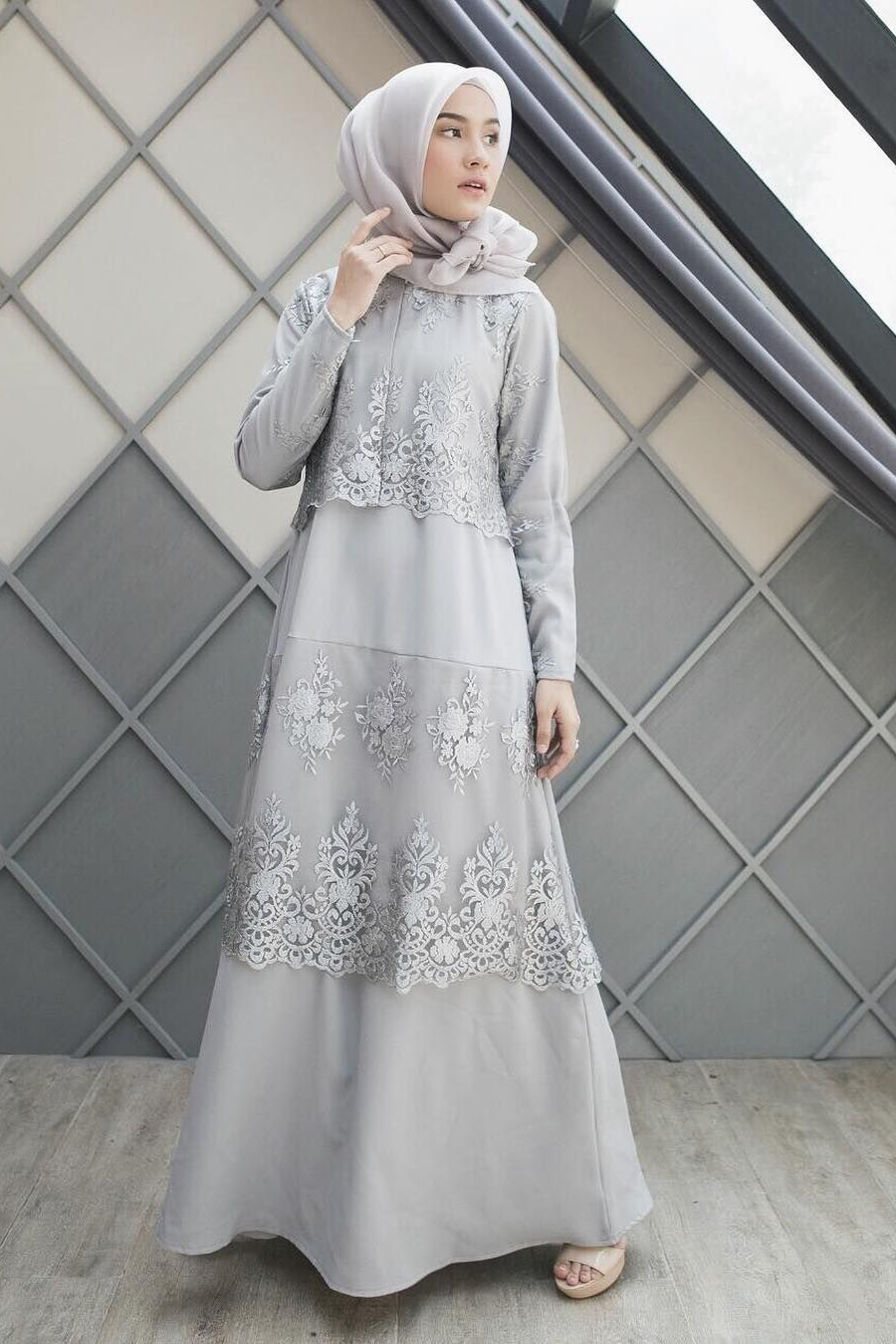 #9. Tahun ini sepertinya warna Silver memang tidak ada matinya. Selendang yang digantung di onesholuder dan ikat ke daerah perut membuat aksen Yunani yak dipadukan dengan HIjab sangat cantik dan anggun.